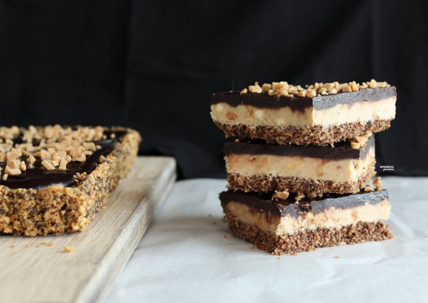 - Pour ganache onto the chilled peanut butter layer. Spread evenly with an offset spatula. Sprinkle toffee bits as a topping (if using). Cover and refrigerate (not freeze this time) for at least 2 hours before serving.