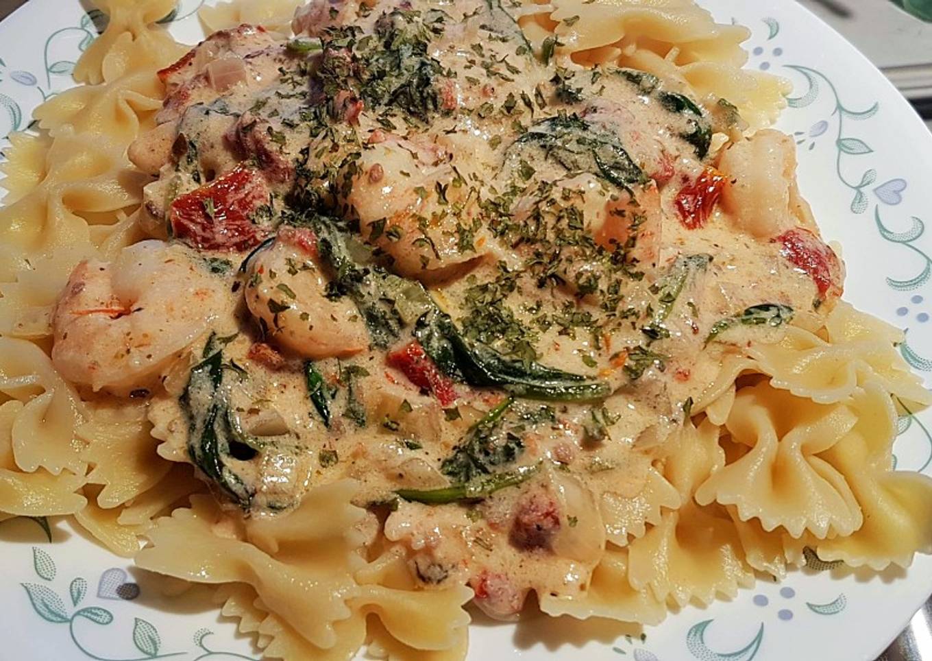 - Add shrimp back into skillet, stir together. Put generous amount on your favorite pasta. Garnish with parsley.